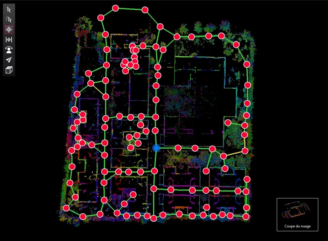 Chaque nuage de points représente donc une zone définie du bâtiment que l’opérateur aura choisi de parcourir. Il s’agira ensuite d’assembler chaque nuage de points. Pour cela, des cibles communes à plusieurs nuages de points devront être relevées.