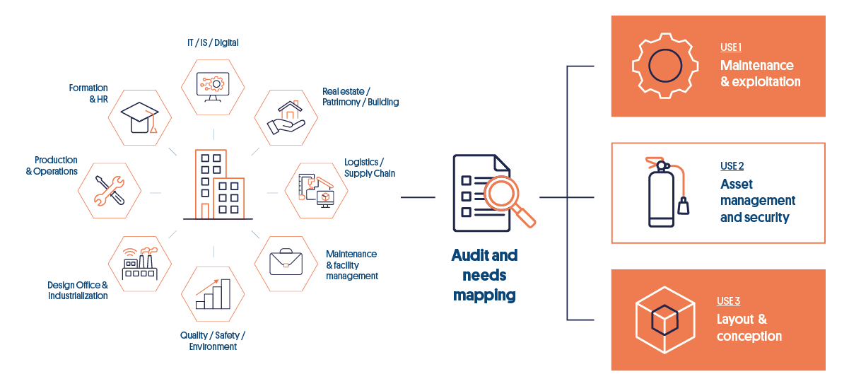 - Cross-functional introspection: It is crucial to identify your real needs by interviewing teams across all functions. From support functions to operational staff (maintenance, IT, construction, security, etc.), the success of the initiative depends on accurately identifying the relevant stakeholders and the value-added business use cases.