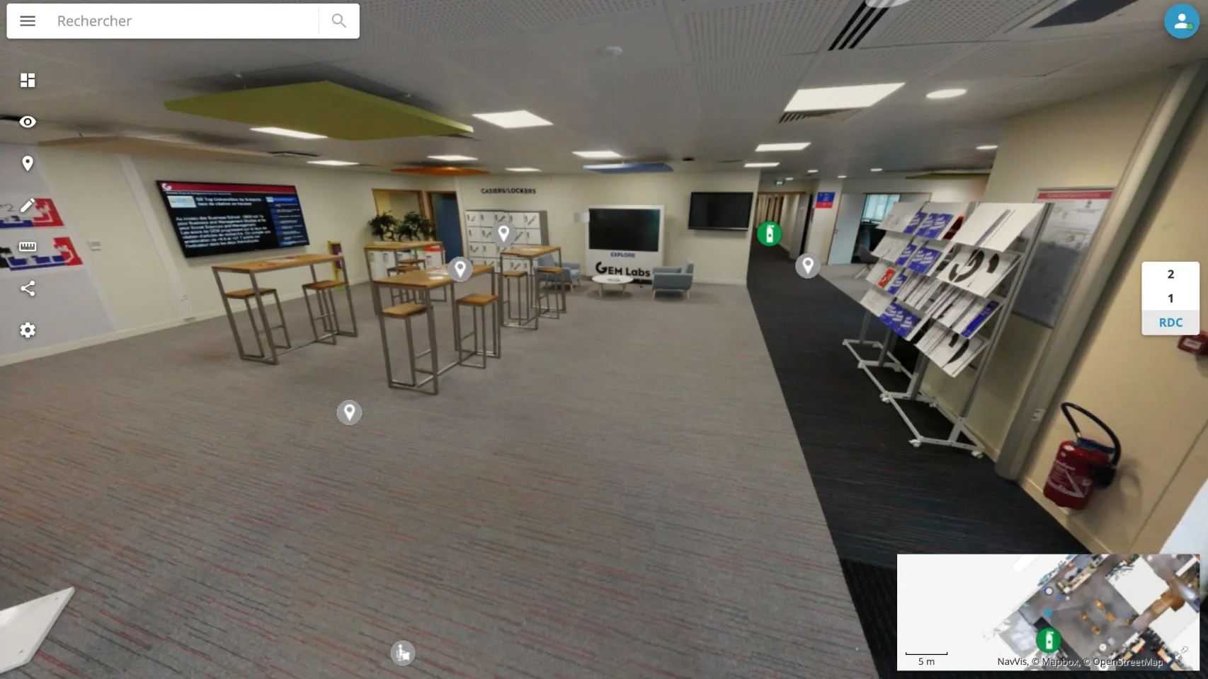 Thus, we first digitized the interior of the building in order to deliver a virtual “Google Street View” tour of the building. Using our NavVis M6 mobile scanning technology, we surveyed the 3,800m² building in just 3 hours. All the 3D data and images captured were then assembled in a virtual visit format. This being accessible from our web platform, each user of the digital building can thus access it and consult the multimedia content added by the administrators via our geolocated points of interest feature.