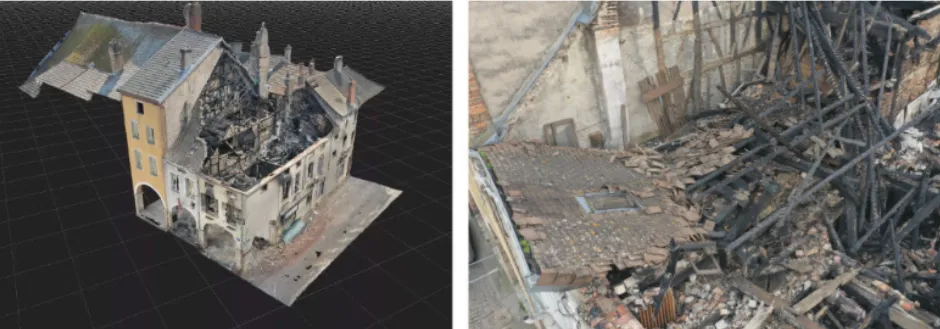 While insurance experts usually take a multitude of photos of their claims projects, it is the digitization of Louhans buildings that allowed them to freeze to archive the condition of the building following the fire. To remotely inspect the site, the point cloud, the virtual tour of the building and the photogrammetric rendering were very complementary supports.