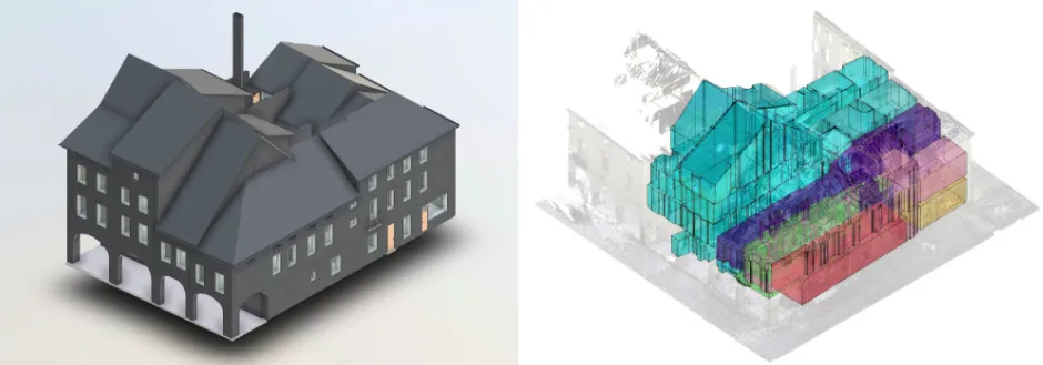 - One 3D point cloud comprehensive overview of the buildings, which served as a basis for the production of up-to-date 2D plans and a digital model.