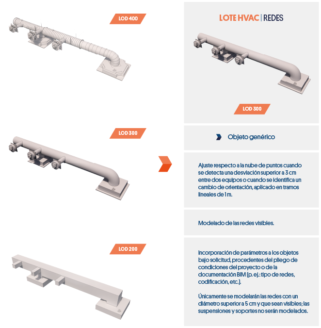 Según el proyecto y las necesidades identificadas junto con las partes interesadas, será necesario definir qué elementos deben modelarse y los niveles de detalle asociados, lo cual quedará recogido en el pliego de condiciones del proyecto.