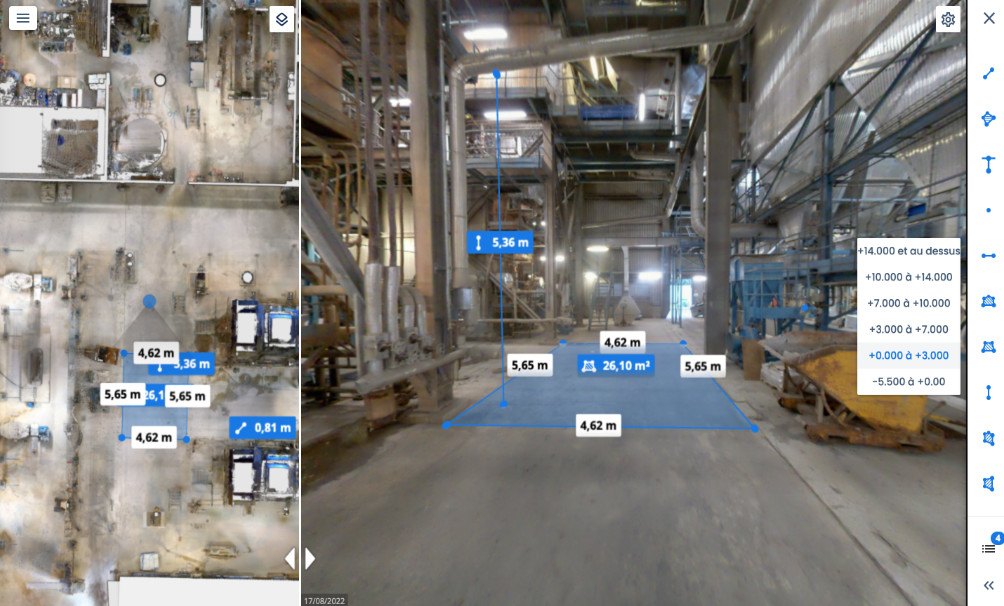 En parallèle, une visite virtuelle du site a été déployée. Basée sur les images panoramiques et le nuage de points 3D captés par le scanner NavVis VLX, elle offre aux utilisateurs une fonctionnalité de prise de mesures directement dans un environnement visuel précis.